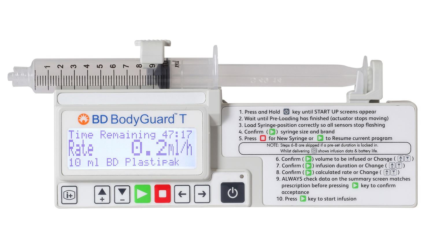 Die BD BodyGuard™ T Spritzenpumpe ist für die Infusion von Medikamenten oder Flüssigkeiten ausgelegt, die eine kontinuierliche oder intermittierende Abgabe mit präzise kontrollierten Raten über alle klinisch akzeptablen Applikationswege – einschließlich subkutan – erfordern. Es handelt sich um eine kleine und leichte Infusionspumpe, die einen reibungslosen Übergang vom Krankenhaus in die häusliche Umgebung ermöglicht.₂